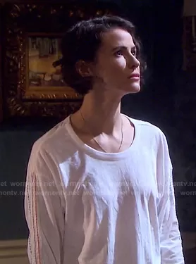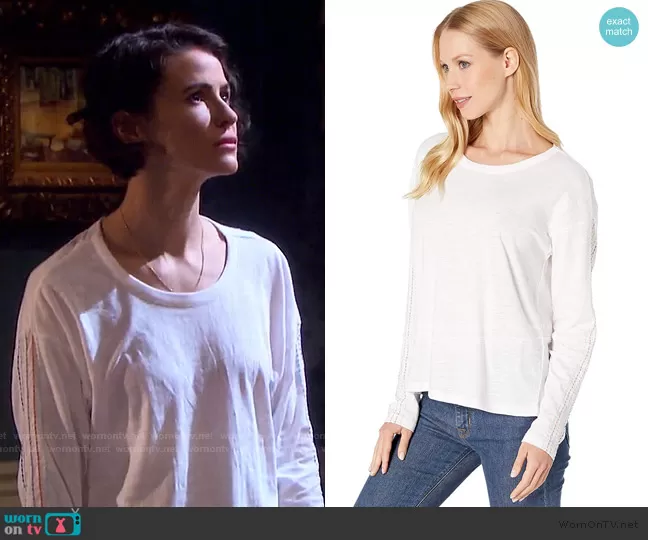 Sarah Horton (played by Linsey Godfrey) on Days of our Lives on Peacock was spotted wearing this white top with multicolor stitching on Days of our Lives on Oct 24 2020's episode. Sarah's Top is the Long Sleeve PJ Top with Multi Stitching by Splendid.