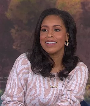 Sheinelle Jones on Today on NBC was spotted wearing this beige and white animal print sweater on Today on Oct 26 2020's episode. Sheinelle's Sweater is the Tiger Stripe Sweater by Rebecca Taylor.