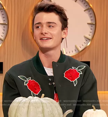 on The Drew Barrymore Show on CBS was spotted wearing this green rose embroidered bomber jacket on The Drew Barrymore Show on Oct 27 2020's episode. 's Jacket is the Rose-Embroidered Varsity Jacket by Lacoste.