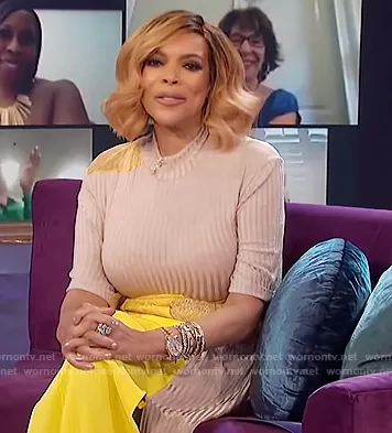 Wendy Williams on The Wendy Williams Show on Various was spotted wearing this beige ribbed colorblock dress on The Wendy Williams Show on Oct 27 2020's episode. Wendy's Dress is the Junction Spiral maxi dress by Christopher Esber.
