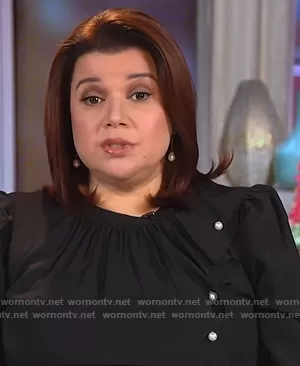 Ana Navarro on The View on ABC was spotted wearing this black pearl embellished blouse on The View on Oct 28 2020's episode. Ana's Top is the Blouse with Pearls by Eloquii.