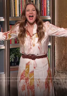 Drew Barrymore on The Drew Barrymore Show on CBS was spotted wearing this printed blouse and skirt on The Drew Barrymore Show on Oct 28 2020's episode. Drew's Top is the Geode Print Zora Blouse by Lafayette 148 . Drew's Skirt is the Geode Print Eleanor Maxi Skirt by Lafayette 148.