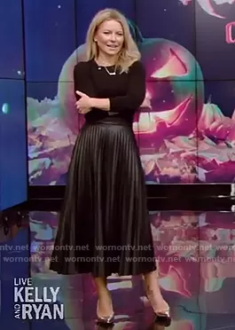 Kelly Ripa on Live with Kelly and Mark on Disney ABC Home Entertainment was spotted wearing this black pleated skirt on Live with Kelly and Ryan on Oct 28 2020's episode. Kelly's Top is the by Isabel Marant . Kelly's Skirt is the Pleated Faux Leather Midi Skirt by Maison Margiela.