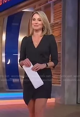 Amy Robach on Good Morning America on ABC was spotted wearing this black pinstripe wrap mini dress on Good Morning America on Oct 28 2020's episode. Amy's Dress is the Bliss Dress by Ba&Sh.