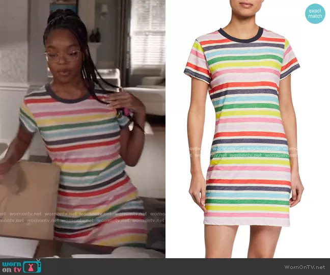 Diane Johnson (played by Marsai Martin) on Black-ish on ABC was spotted wearing this multicolor striped t-shirt dress on Black-ish on episode 'Dre At Home Order' (7x04) in Oct 2020. Diane's Dress is the Striped T-Shirt Dress by Pam & Gela.
