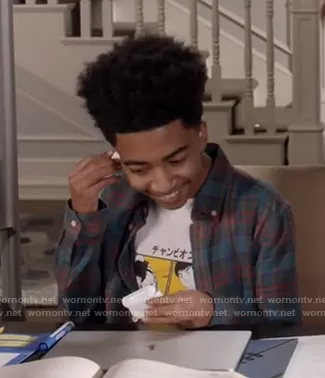Jack Johnson (played by Miles Brown) on Black-ish on ABC was spotted wearing this white graphic print tee on Black-ish on episode 'Dre At Home Order' (7x04) in Oct 2020. Jack's Shirt is the Printed T-Shirt by Oliver and Benji @ Films TV Tokio by Zara.