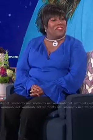 Sheryl Underwood on The Talk on CBS was spotted wearing this blue ruffle cuff blouse on The Talk on Oct 29 2020's episode. Sheryl's Top is the Kitty Silk Blouse by Kobi Halperin.