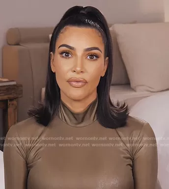 Kim Kardashian on Keeping Up with the Kardashians on E! was spotted wearing this metallic turtleneck bodysuit on Keeping Up with the Kardashians on episode 'Things Fall Apart: COVID-19' (19x07) in Oct 2020. Kim's Bodysuit is the Metallic Bodysuit by Versace.