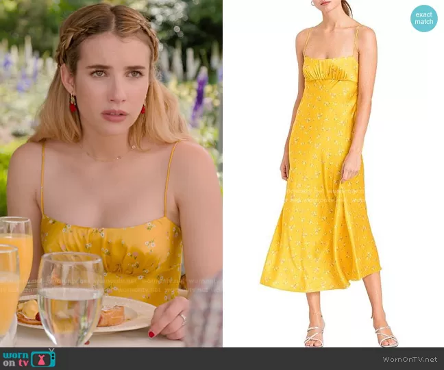 Sloan (played by Emma Roberts) on Holidate (2020) on Netflix was spotted wearing this yellow Mother on Oct 27 2020's episode. Sloan's Dress is the Only In Paris Floral Silk Dress by Bec & Bridge.
