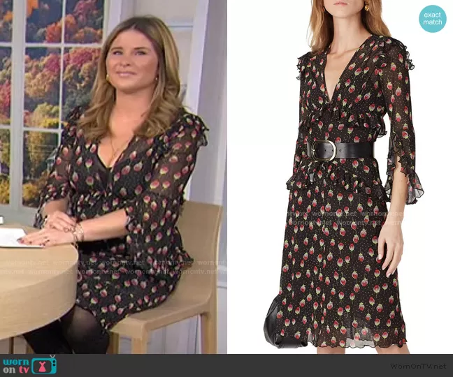 Jenna Bush Hager on Today on NBC was spotted wearing this black floral ruffle dress on Today on Nov 02 2020's episode. Jenna's Dress is the Red Roses Dress by Anna Sui.