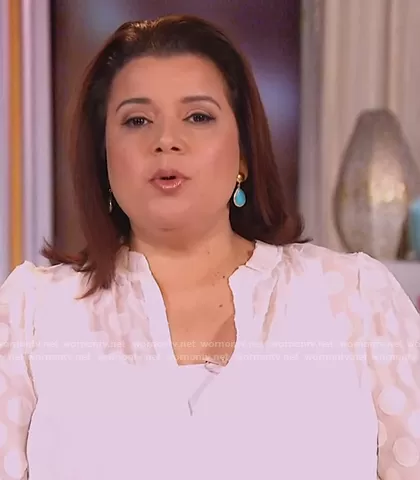 Ana Navarro on The View on ABC was spotted wearing this white mesh polka dot blouse on The View on Nov 02 2020's episode. Ana's Top is the Ruffle Neck Blouse With Flounce Cuff by Eloquii.