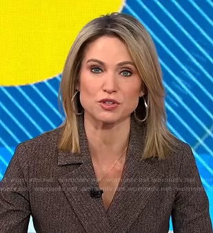 Amy Robach on Good Morning America on ABC was spotted wearing this brown herringbone suit on Good Morning America on Nov 02 2020's episode. Amy's Jacket is the Karin Jacket by Chiara Boni La Petite Robe . Amy's Pants is the Printed Venusette Pants by Chiara Boni La Petite Robe.