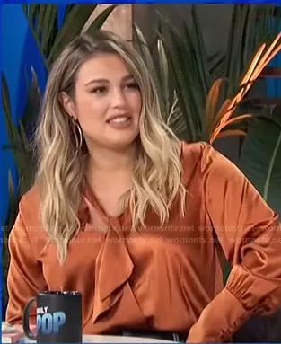 Carissa Loethen Culiner on E! News on E! was spotted wearing this orange tie neck satin blouse on E! News Daily Pop on Nov 02 2020's episode. Carissa's Bodysuit is the Tess Bodysuit by Jonathan Simkhai.