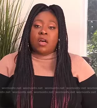 Loni Love on The Real on BETher was spotted wearing this colorblock sweater on The Real on Nov 02 2020's episode. Loni's Sweater is the Colorblock Sweater by Eloquii.
