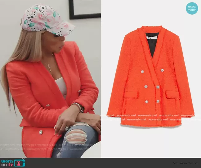 Karen Huger on The Real Housewives of Potomac on Bravo was spotted wearing this orange tweed blazer on The Real Housewives of Potomac on episode 'Hats Off ... Shades On' (5x14) in Nov 2020. Karen's Blazer is the Orange Tweed Blazer by Zara.
