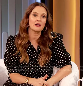 Drew Barrymore on The Drew Barrymore Show on CBS was spotted wearing this black polka dot dress on The Drew Barrymore Show on Nov 03 2020's episode. Drew's Dress is the Polka-dot printed silk ascot tie pleated midi dress by Celine . Drew's Shoes is the Haley 100 over the knee Suede Boots by Jimmy Choo.