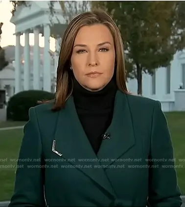 Mary Bruce on Good Morning America on ABC was spotted wearing this teal wrap coat on Good Morning America on Nov 14 2025's episode. Mary's Coat is the Ellgenic Long Belted Coat by Ted Baker.