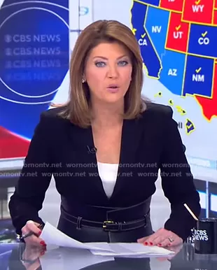 Norah O'Donnell on CBS Evening News on CBS was spotted wearing this black wide belt on CBS Evening News on Dec 18 2020's episode. Norah's Belt is the Obie Leather Corset Belt by Altuzarra.