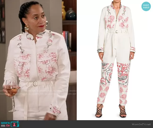 Rainbow Johnson (played by Tracee Ellis Ross) on Black-ish on ABC was spotted wearing this white sun print jumpsuit on Black-ish on episode 'Age Against the Machine' (7x05) in Nov 2020. Rainbow's Jumpsuit is the We Are The Weather Cotton Jumpsuit by Stella McCartney.