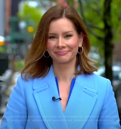 Rebecca Jarvis on Good Morning America on ABC was spotted wearing this blue double breasted coat on Good Morning America on May 10 2021's episode. Rebecca's Coat is the Double Cloth Wool Double Breasted Coat by J. Crew.