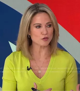 Amy Robach on Good Morning America on ABC was spotted wearing this yellow v-neck sweater on Good Morning America on Nov 05 2020's episode. Amy's Sweater is the Contrast V-Neck Wool Sweater by Paul Smith . Amy's Skirt is the Esma Etched Croco Knee-Length Leather Skirt by Lafayette 148 New York.