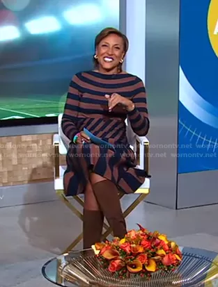 Robin Roberts on Good Morning America on ABC was spotted wearing this black and brown striped dress on Good Morning America on Jan 11 2021's episode. Robin's Dress is the Knitted Camelot Dress by The Fold London.