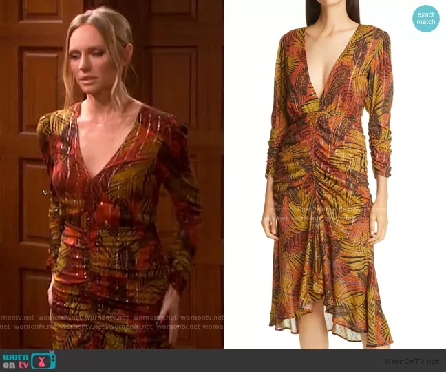 Abigail Deveraux (played by Marci Miller) on Days of our Lives on Peacock was spotted wearing this orange printed ruched dress on Days of our Lives on Nov 06 2020's episode. Abigail's Dress is the Crosby Ave Ruched Midi Dress by Le Superbe.
