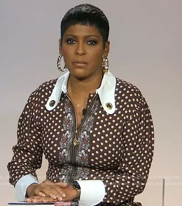 Tamron Hall on Tamron Hall Show on ABC was spotted wearing this brown polka dot dress on Tamron Hall Show on Nov 06 2020's episode. Tamron's Dress is the Embellished silk-trimmed printed crepe maxi dress by Chloe.