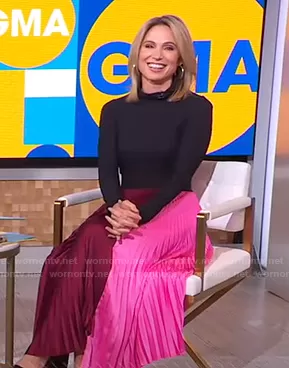 Amy Robach on Good Morning America on ABC was spotted wearing this black top and red and pink pleated skirt on Good Morning America on Nov 06 2020's episode. Amy's Top is the Lupis Mockneck Jersey Top by Chiara Boni La Petite Robe . Amy's Skirt is the Grainger Colorblock Pleated Midi Skirt by A.L.C..