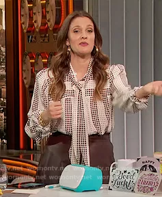 Drew Barrymore on The Drew Barrymore Show on CBS was spotted wearing this white dot print tie neck blouse on The Drew Barrymore Show on Nov 09 2020's episode. Drew's Top is the geometric-print silk blouse by Ports 1961 . Drew's Skirt is the Sumner Plonge Leather Midi Skirt by Lafayette 148 New York.