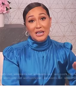 Adrienne Houghton on The Real on BETher was spotted wearing this blue satin turtleneck blouse on The Real on Nov 09 2020's episode. Adrienne's Top is the Turtleneck Blouse by Divine Heritage.