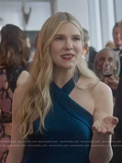 Sylvia Steineitz (played by Lily Rabe) on The Undoing on HBO was spotted wearing this blue cross neck gown on The Undoing on episode 'The Undoing' (1x01) in Nov 2020. Sylvia's Dress is the Pandora Gown by Galvan.