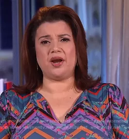 Ana Navarro on The View on ABC was spotted wearing this zig-zag floral print dress on The View on Nov 11 2020's episode. Ana's Dress is the Mixed Print Tie Neck Fit and Flare Dress by Eloquii.