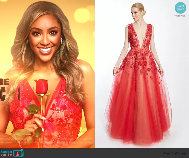 Tayshia Adams on The Bachelorette on ABC was spotted wearing this opening scene dress on The Bachelorette on episode 'Week 5' (16x05) in Nov 2020. Tayshia's Dress is the Flame Collette Gown by Randi Rahm .