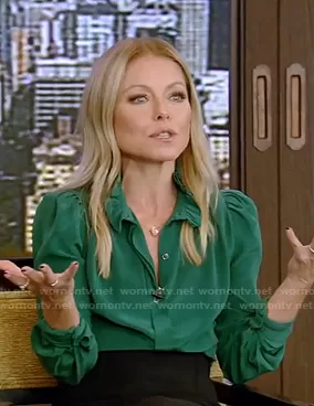 Kelly Ripa on Live with Kelly and Mark on Disney ABC Home Entertainment was spotted wearing this green blouse and black pencil skirt on Live with Kelly and Ryan on Nov 11 2020's episode. Kelly's Top is the Lamia Ruffle-Trimmed Silk Blouse by Isabel Marant . Kelly's Skirt is the Arreton Fitted Pencil Skirt by Roland Mouret . Kelly's Shoes is the Suede Pumps by by Gianvito Rossi.