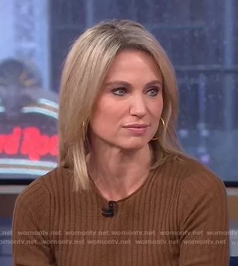 Amy Robach on Good Morning America on ABC was spotted wearing this brown ribbed sweater and skirt on Good Morning America on Nov 12 2020's episode. Amy's Sweater is the Microstripe Crew Pullover by Vince . Amy's Skirt is the Printed Belted Pleated Skirt by Bardot.