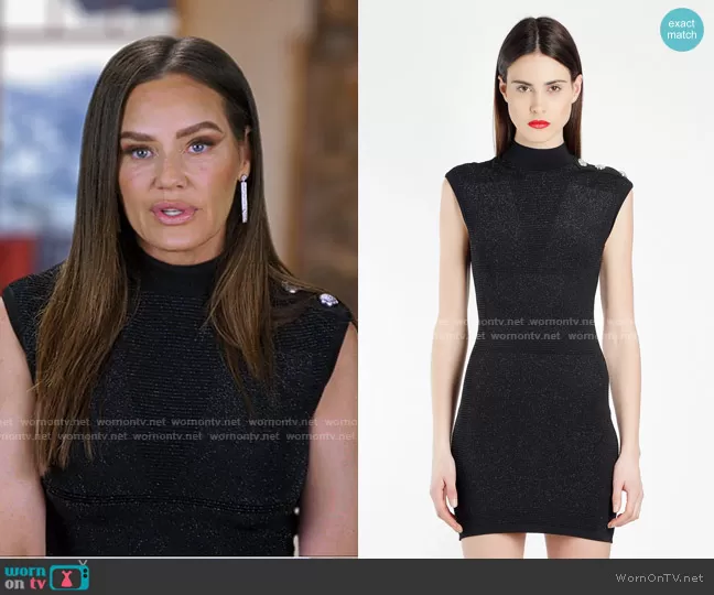 Meredith Marks on The Real Housewives of Salt Lake City on Bravo was spotted wearing this black button detail knit dress on The Real Housewives of Salt Lake City on episode 'Welcome to Salt Lake City!' (1x01) in Nov 2020. Meredith's Dress is the Lurex Dress by Balmain.