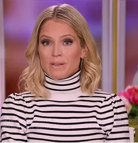 Sara Haines on The View on ABC was spotted wearing this striped turtleneck sweater on The View on Nov 13 2020's episode. Sara's Top is the Karla Stripe Rib Bishop Sleeve Top by A.L.C..
