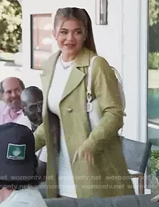 Kylie Jenner on Keeping Up with the Kardashians on E! was spotted wearing this green coat and mini dress on Keeping Up with the Kardashians on episode 'Love Lockdown' (19x08) in Nov 2020. Kylie's Dress is the The NW Mini Dress by Naked Wardrobe . Kylie's Coat is the Green Metal Belted Ostrich-effect Leather Coat by Saks Potts . Kylie's Bag is the Saddle Leather Clutch Bag by Christian Dior.