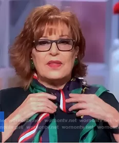 Joy Behar on The View on ABC was spotted wearing this printed scarf on The View on Nov 16 2020's episode. Joy's Scarf is the Horsebit-print silk scarf by Gucci.