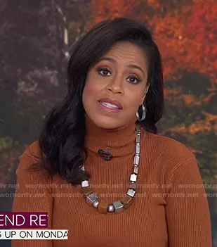 Sheinelle Jones on Today on NBC was spotted wearing this brown turtleneck sweater on Today on Nov 16 2020's episode.