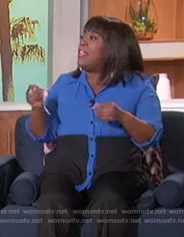Sheryl Underwood on The Talk on CBS was spotted wearing this blue colorblock shirt on The Talk on Nov 16 2020's episode. Sheryl's Top is the Colorblock Button Front Shirt by Karen Kane.