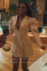 Candiace Dillard Bassett on The Real Housewives of Potomac on Bravo was spotted wearing this pink floral metallic blazer dress on The Real Housewives of Potomac on episode 'Picking Sides' (5x16) in Nov 2020. Candiace's Dress is the Notched Collar Floral Jacquard Blazer Dress by Shein.