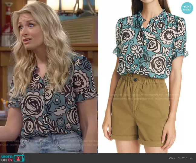 Gemma (played by Beth Behrs) on The Neighborhood on CBS was spotted wearing this green floral top on The Neighborhood on episode 'Welcome to the Movement' (3x01) in Nov 2020. Gemma's Top is the Rosella Button-Up Shirt by Samsoe Samsoe.