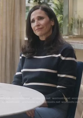 Delia (played by Michaela Watkins) on The Unicorn on CBS was spotted wearing this blue stripe sweater on The Unicorn on episode 'It's the Thought That Counts' (2x03) in Dec 2020. Delia's Sweater is the Cashmere mockneck sweater in stripe by J. Crew.
