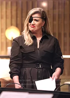 Kelly Clarkson on The Voice on NBC was spotted wearing this black belted zip front dress on The Voice on Nov 17 2020's episode. Kelly C's Dress is the Belted Pleated Shell Midi Dress by Moncler.