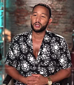 John Legend on The Voice on NBC was spotted wearing this black star print shirt on The Voice on Nov 17 2020's episode. John's Shirt is the Star Print Silk Oversize Bowling Shirt by Gucci.