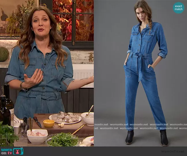 Drew Barrymore on The Drew Barrymore Show on CBS was spotted wearing this denim jumpsuit The Drew Barrymore Show on Nov 17 2020's episode. Drew's Jumpsuit is the Pilcro Classic Denim Jumpsuit by Anthropologie.