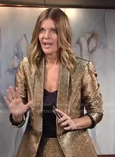 Phyllis Summers (played by Michelle Stafford) on The Young and the Restless on CBS was spotted wearing this metallic gold suit on The Young and the Restless on Nov 17 2020's episode. Phyllis's Jacket is the Dahlia Metallic Blazer by Ramy Brook . Phyllis's Pants is the Lucinda Metallic Skinny Pants by Ramy Brook.