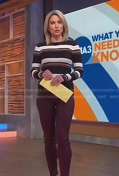 Amy Robach on Good Morning America on ABC was spotted wearing this striped ribbed sweater and skinny pants on Good Morning America on Nov 17 2020's episode. Amy's Sweater is the Panel Stripe Ribbed Knit Crew Neck Sweater by Frame . Amy's Pants is the Faux Leather Pants by Level 99.